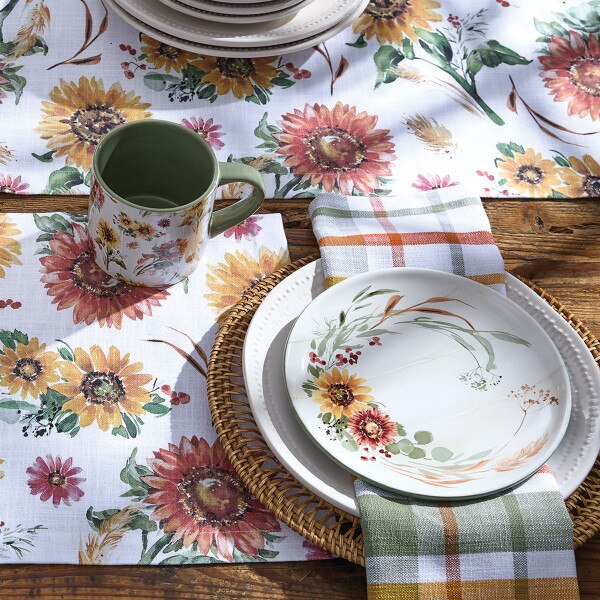Flourish your seasonal kitchen setting with festive fall vibes brought by this ceramic salad plate. Beautifully designed by the talented artist Katrina Pete, this rustic ceramic captures the cozy feel of the summer or autumn season from the timeless sunflowers and leaf accents in a wonderful watercolor design. Each plate is carefully crafted to bring a sense of warmth and coziness to your harvest dining table, adding both functionality and aesthetic visual appeal to your daily meals and seasonal gatherings. Perfect practical and decorative backdrop to utilize when serving appetizers, salads, cookies, and more!