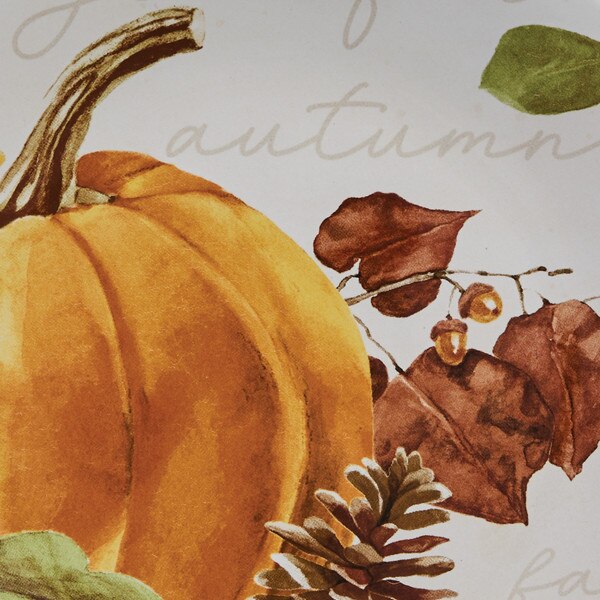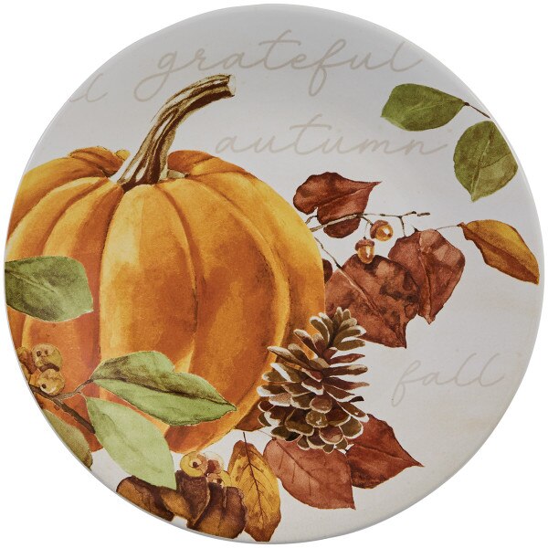 Flourish your seasonal kitchen setting with festive fall vibes brought by this ceramic salad plate. Beautifully designed by the talented artist Lucca Sheppard, this rustic ceramic captures the cozy feel of the autumn season highlighted by a detailed pumpkin, pinecone, acorn, and leaf nature design against a white ground with subtle seasonal phrases including 'grateful,' 'autumn,' and 'fall' in elegant cursive lettering. Each plate is carefully crafted to bring a sense of warmth and coziness to your harvest dining table, adding both functionality and aesthetic visual appeal to your daily meals and seasonal gatherings. Perfect practical and decorative backdrop to utilize when serving appetizers, salads, cookies, and more!